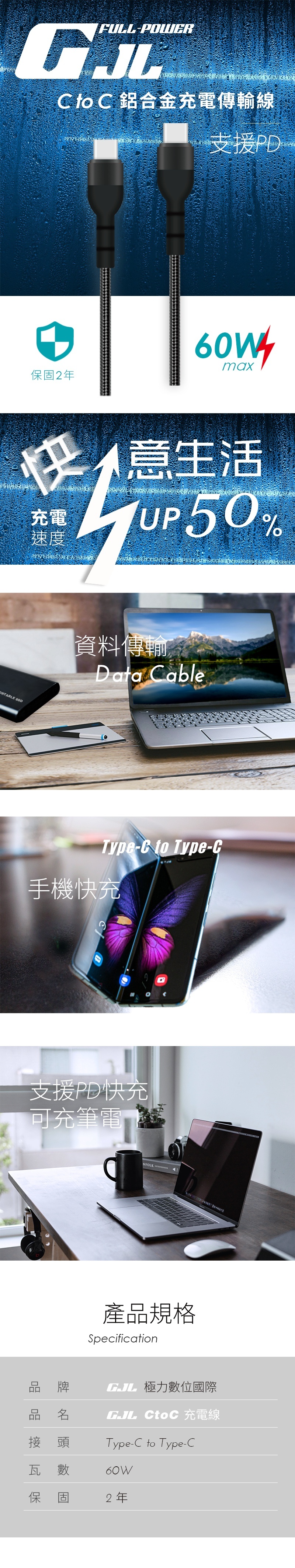【GJL極力】Type-C to Type-C 鋁合金高速快充傳輸線