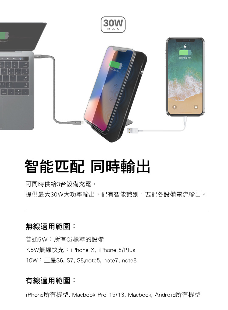 ●可同時供給3台設備充電,提供最大30W大功率輸出